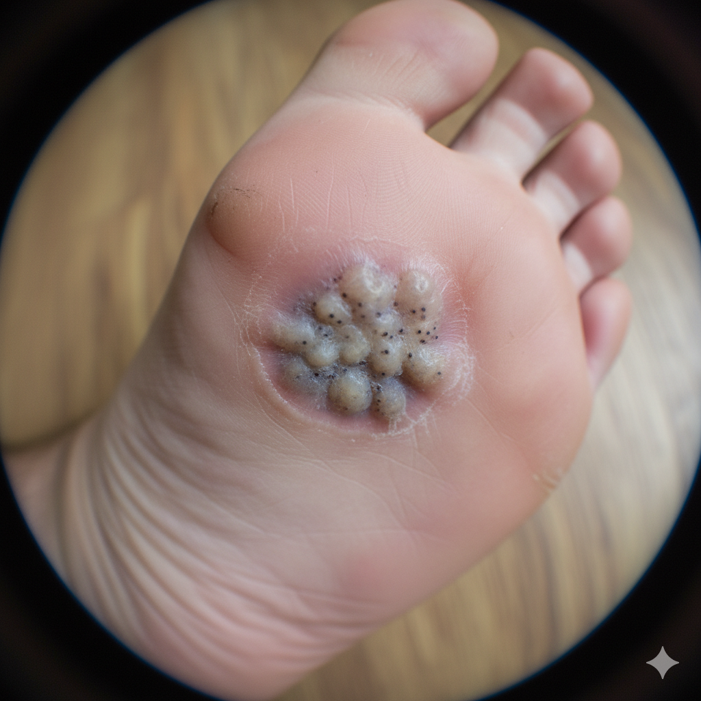 O olho de peixe, conhecido cientificamente como verruga plantar, é uma lesão causada pelo papilomavírus humano (HPV) que afeta a planta dos pés.